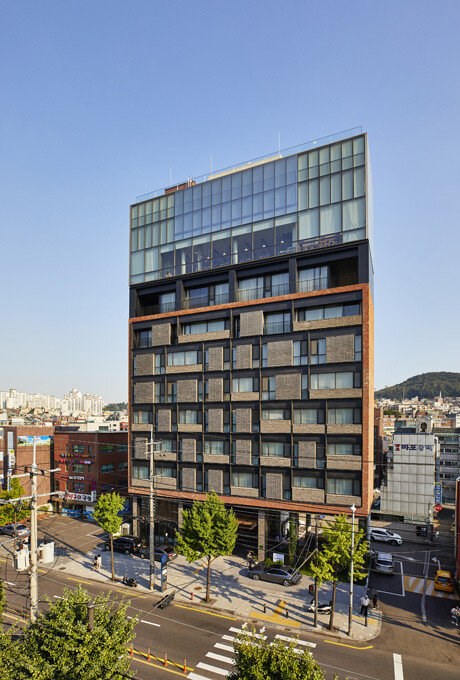 1급 호텔치곤 덩치는 그리 크지 않다. 지상 10층 지하 2층에 객실은 43개밖에 되지 않는다. 하지만 주변이 5층 안팎의 상가에 빌라 아니면 주택단지다 보니 멀리서 보면 우뚝 솟아 있다. 이런 경우 보통은 그 존재감을 각인시키려 하기 마련. 하지만 핸드픽트 호텔 경우엔 반대로 그 존재감을 희석시키는 것이 지상과제였다. 설계를 맡은 ‘로 디자인’의 김동진 대표(홍익대 교수)가 건축 프로젝트에 부여한 명칭은 ‘카무플라주(camouflage)’. ‘은폐’ ‘위장’이라는 뜻의 프랑스어다.