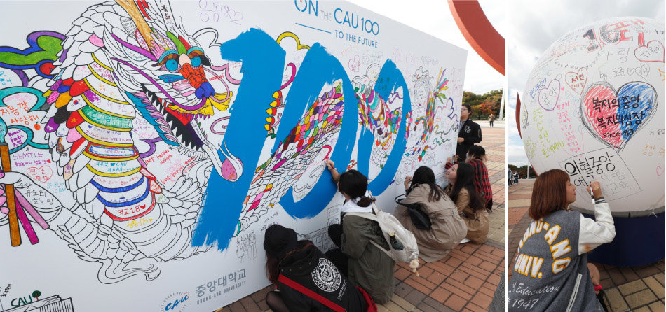 중앙대 학생들이 ‘개교 100주년’을 축하하며 설치물에 메시지를 남기고 있다.