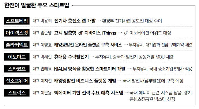 한전과 스타트업 간 협업도 이뤄진다. 전기차충전소 위치 안내 앱을 개발하는 이비온(대표 유병훈)은 한전 신사업기획처 EV&인프라 부서와 함께 앱을 공동 개발 중이다. 태양광패널 세척솔루션을 개발하는 리셋컴퍼니(대표 정성대)는 한전 신태백 변전소 내 태양광 설비에 개발한 제품을 설치해 테스트 베드(Test Bed·새로운 기술·제품·서비스의 성능 및 효과를 시험하는 것)를 수행 중이다.