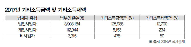 2018년 국세통계에 따르면 2017년 기타소득세액은 약 1조3000억 원이었다. 이 중 법인사업자의 납부액은 약 1조2700억 원, 개인사업자와 비사업자의 납부액은 약 284억 원이었다. 기타소득세를 납부하는 개인사업자와 비사업자를 합하면 약 11만6000명이었다. 이들의 기타소득금액은 약 5630억 원. 1인당 기타소득은 약 484만 원이었다.