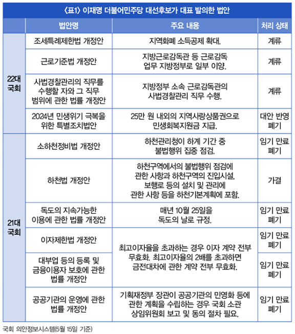 이 후보는 민선 7기 경기지사를 끝으로 2022년 국회에 입성, 21·22대 국회에서 활동했다. 국회 의안정보시스템에 따르면, 이 기간 이 후보는 10개의 법안을 대표 발의했다. 5월 15일 기준 3개 법안이 계류 중이며, 임기 만료로 5개, 대안 반영으로 1개 법안이 폐기됐다(표1 참조).