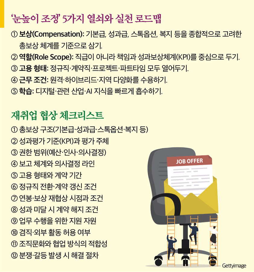 조건을 양보하라는 것이 아니라 ‘조정’하라는 얘기다. 흔히 “눈높이를 낮추라”는 말을 하지만 필자는 다르게 말한다. “현실에 맞게 조정하라.” 낮춘다는 표현에는 패배의 뉘앙스가 담겨 있지만, 조정은 전략이다. 물론 연봉은 줄어들 수 있지만 근무 형태·지역·성장 옵션을 통해 새로운 기회를 찾을 수 있다. 마찬가지로 직급 역시 낮아질 수 있다. 그러나 영향력은 직급이 아니라 책임과 성과에서 나온다. 고용 형태가 유연해질 수 있으나, 이 역시 성과를 증명한 뒤 재협상하면 된다.