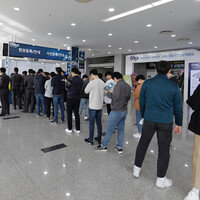 11월 1일 ‘제3회 2019 대한민국 스마트 국방 ICT 산업박람회’를 찾은 관람객들이 줄지어 등록을 하고 있다. 10월 31일 경북 구미시 구미코에서 개막한 이번 박람회는 11월 2일까지 열린다. [지호영 기자]