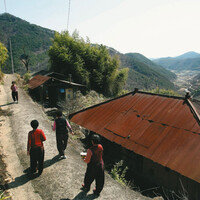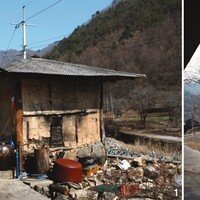 1 마을 할머니들. 할머니 몇 분과 할아버지 한 분이 살고 있다.2 폐허가 된 마을회관 내 책장에 꽂혀 있는 고전들.3 돌담 틈으로 어렵게 싹을 틔운 접시꽃.4 봄 거름내기에 나선 마을 노인. 등이 휠 것 같은 삶의 무게가 느껴진다…