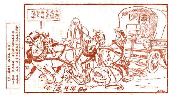 일본이 제국주의적 팽창을 본격화하던 시기, 세계의 분열과 불안을 들여다보는 일은 조선의 미래를 가늠하는 일이기도 했다. ‘신동아’는 이 만평을 통해 일본 역시 문명을 이끄는 말이 아님을 환기한다.