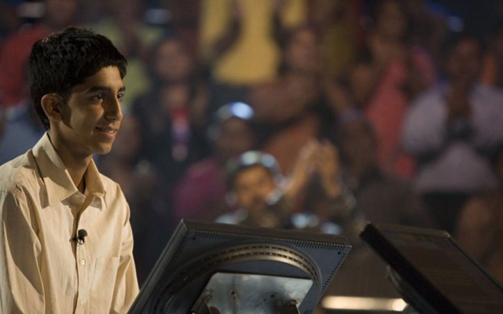 영화 ‘슬럼독 밀리어네어’에서 주인공 자말 말릭이 극 중 유명 TV 퀴즈 쇼 ‘누가 백만장자가 되고 싶은가’에 출연해 문제를 푸는 모습. IMDB