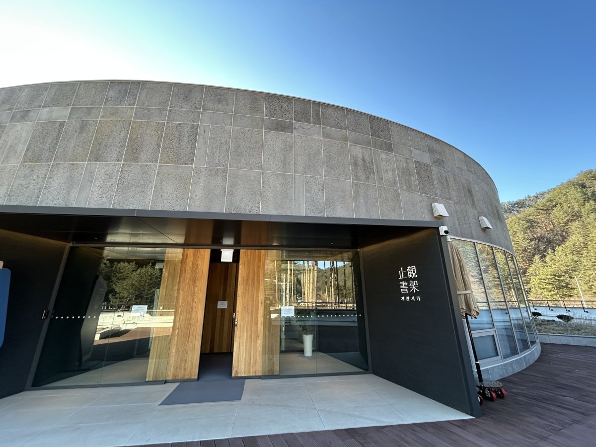 울진의 경우 금강송 에코리움 단지 안에 있던 금강송 테마전시관 2층 공간을 활용해 북 카페와 서재를 꾸몄다. 지관서가는 지역마다 각각의 도서 큐레이션 콘셉트가 있는데 이곳은 ‘숨과 쉼’이다. 둥근 건물 그대로 동선을 살린 내부에 들어서면 ‘홀로 있음과 관조’ ‘물러섬과 관찰’ ‘상처와 애도’ ‘사랑과 연결’ ‘균형과 조화’ ‘예술과 창의’ 등의 제목으로 큐레이션된 다양한 도서를 만날 수 있다.
