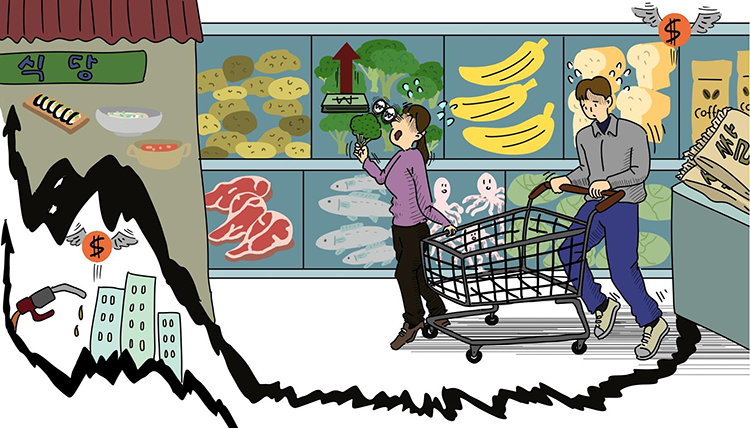 커피(11.4%), 빵(5.8%) 등 가공식품 가격도 치솟았다. 국제유가는 내렸지만 환율 상승과 유류세 축소 등으로 석유류 가격도 6.1% 올랐다.
