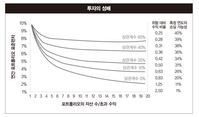‘투자의 성배’의 결론은 상관성이 낮은 자산군 여러 개에 분산 투자하면 전체 포트폴리오의 리스크를 낮출 수 있으며 연간 손실 가능성도 크게 줄일 수 있다는 내용이다.