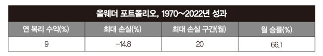 로빈스가 나중에 이 포트폴리오를 백테스트해 봤는데 결과가 너무 좋아 감탄했다고 한다. 훗날 이 전략은 ‘올웨더 포트폴리오’라고 불린다. 이 포트폴리오의 1970~2022년 성과를 살펴보겠다.