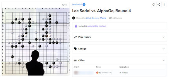 이세돌이 인공지능(AI) 알파고와 벌인 5번기 제4국이 2021년 5월 오픈씨(OpenSea)의 NFT 경매에 올라 19만8957달러에 낙찰됐다. OpenSea