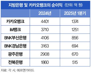 올해도 이 같은 우려가 이어질 전망이다. 지역 경기 부진으로 실적과 재정건전성에 빨간불이 들어왔기 때문이다. 부산은행의 당기순이익은 1년 사이 31.6% 급감한 856억 원을 기록했다. 경남은행이 31.4% 하락한 694억 원을, 광주은행(670억 원)과 전북은행(515억 원)은 각각 8.6%, 8.7% 감소했다. 카카오뱅크의 1분기 당기순이익은 1374억 원이다.