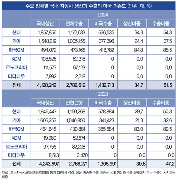업종별로 보면 대미 수출에서 절대적 비중을 차지하는 것이 자동차산업이다. 전체 대미 수출에서 자동차산업은 32%를 차지했다. 우리 자동차산업에서도 대미 수출은 절대적 중요성을 지니고 있다. 지난해 수출액 기준으로 자동차산업 전체 수출의 46.7%가 미국에 집중됐고, 완성차는 49.1%에 달했다. 자동차 수출 대수 기준으로는 51.5%가 미국이었고, 우리나라 전체 자동차 생산에서 차지하는 비중도 34.7%에 달했다. 한국GM의 경우 생산의 84.8%를 미국 수출에 의존하는 실정이라 미국 수출이 어려워지면 기업의 존립이 위태로울 수밖에 없다.