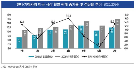 한국에서의 업체별 자동차 수출 대수를 보면 현대·기아는 4월 16.6%, 5월 21.1%, 6월 10.0% 감소했지만, 한국GM은 12.2%, 3.5%, 11.1% 감소하는 데 그쳤다. 미국의 수입차 판매 시장에서는 관세가 부과된 4~6월 판매량이 현대·기아는 8.7% 늘고, 한국GM은 5.2%가 늘어 한국 기업 전체로는 7.6%가 증가했다. 한국에서의 수출은 감소했지만, 수출된 차의 판매량은 미국 시장에서 증가했다는 것이다. 이와 더불어 현대·기아차의 현지 생산도 늘고 있다. 4월 10.1% 늘어난 데 이어 5월 22.4% 늘었고, 6월에도 3.8%가 증가했다. 수출 차량의 판매 규모가 늘어나는 가운데 현지 생산도 늘어 현대·기아차의 미국 시장 판매는 지속 증가하고 있고, 시장점유율도 상승하고 있다. 미국 시장에서 현대·기아차의 판매 증가율은 4월 16.2%, 5월 6.7%, 6월 0.9%, 7월 13.2% 등 비교적 높은 수준을 기록했다(그래프 참조).