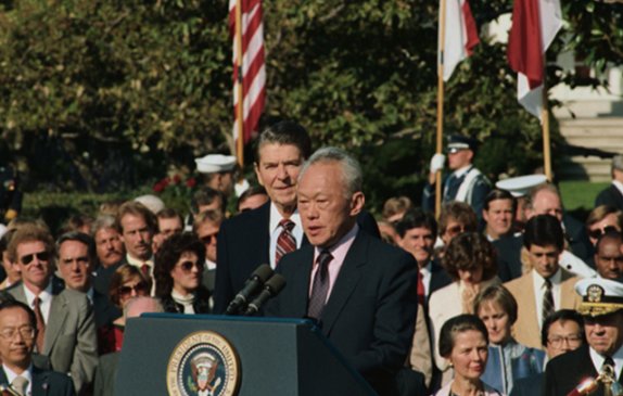 1985년 10월 로널드 레이건 미국 대통령과 정상회담을 위해 백악관을 방문한 리콴유 총리가 연설하고 있다. Gettyimage