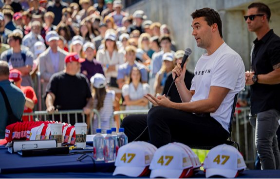 9월 10일 미국 유타주 오렘에 있는 유타 밸리 대학교에서 찰리 커크가 연설하고 있다. 행사 도중 커크는 타일러 로빈슨이 쏜 총에 맞아 사망했다. 뉴시스