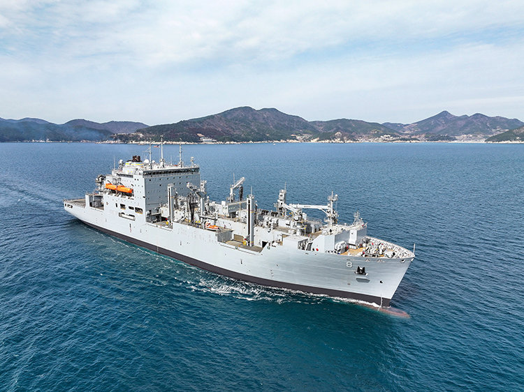 2025년 3월 미국 해군 군수지원함인 ‘월리 쉬라’호가 경남 거제시에 위치한 한화오션 거제사업장에서 함정 정비를 성공적으로 마치고 출항하고 있다. 한화오션 홈페이지