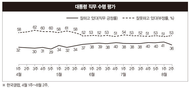 한국갤럽 8월 2주 여론조사에 따르면 문 대통령 직무 긍정률은 36%에 그쳤다. 반면 직무 부정률은 53%를 나타냈다. 최근 코로나19 하루 확진자 수가 2000명 전후를 기록하고, 백신 확보가 차질을 빚으면서 부정 여론이 확산했기 때문이다. 24회에 걸쳐 각종 부동산대책을 내놨지만 수도권 아파트 상승세가 계속되고 있는 것도 주요 원인이다(한국갤럽 자체, 8월 10~12일 1002명, 표본오차 95% 신뢰수준 ±3.1%포인트).