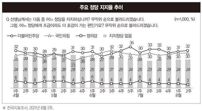 NBS에 따르면 8월 2주 민주당 지지율은 32%로 국민의힘과 오차범위 내에서 치열한 각축을 벌이고 있다. 민주당 지지율은 올해 초 여유 있게 앞섰으나 3월부터는 국민의힘과 차이가 줄어들어 접전을 벌이기 시작했다. 4·7 재·보궐선거 전후론 양당의 지지율 차이가 거의 없었다. 6월 전당대회 이준석 대표 체제 출범 이후엔 국민의힘 지지율이 민주당을 역전하기도 했다. 민주당과 국민의힘은 정당 지지율에선 거의 우열을 가리기 어려운 형국이 이어지는 셈이다(4개 기관 공동조사, 8월 9~11일 1017명 대상, 표본오차 95% 신뢰수준 ± 3.1%포인트).