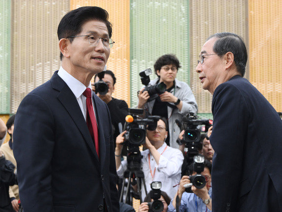 김문수 국민의힘 대선 후보(왼쪽)와 한덕수 무소속 대선 후보가 5월 8일 국회 사랑재에서 만나 후보 단일화를 위한 2차 회동을 마친 뒤 자리를 뜨고 있다.