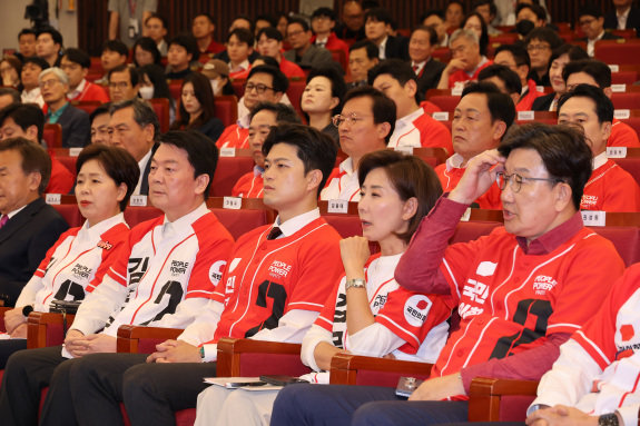 김용태 국민의힘 비상대책위원장을 비롯한 국민의힘 의원들이 6월 3일 서울 여의도 국회 도서관에 마련된 21대 선 개표상황실에서 출구조사 결과를 지켜보고 있다. 뉴스1