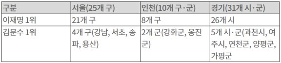 경기도 기초자치단체는 모두 31개 시·군이다. 이 대통령은 이 가운데 26개 시·군에서 득표율 1위를 지켰다. 대부분 지역에서 득표율 50%를 넘을 정도로 압도적이었다. 이 대통령은 이준석 개혁신당 후보의 지역구가 속해 있는 화성을에서도 52.60%를 득표해 김 후보(32.42%), 이준석 후보(13.99%)를 멀찍이 따돌렸다.