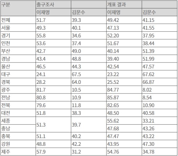 출구조사와 개표 결과 1, 2위가 뒤집힌 곳은 울산과 강원이다. 두 곳 모두 이 후보가 1위로 예측됐지만 개표 결과 김 후보가 1위를 차지했다. 출구조사 결과 이 대통령이 10%포인트 이상 앞서는 것으로 전망됐던 대전, 충남·세종, 충북은 격차가 4∼8%포인트 안팎으로 크게 줄었다. 부산과 경남도 출구조사에선 김 후보가 5∼7%포인트로 앞섰지만, 개표에선 10%포인트 이상으로 격차가 확대됐다. 출구조사가 빗나간 곳은 주로 보수 성향이 강한 곳이다. 즉 방송 3사 출구조사는 ‘샤이보수’를 놓친 것이다.