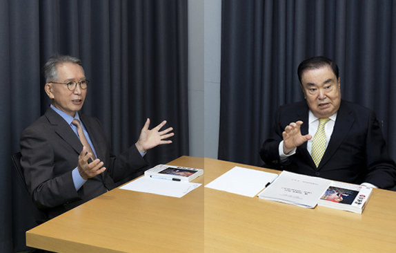 김형오·문희상 전직 국회의장들이 9월 9일 동아일보 충정로사옥에서 ‘한국 정치’를 주제로 대담하고 있다. 박해윤 기자
