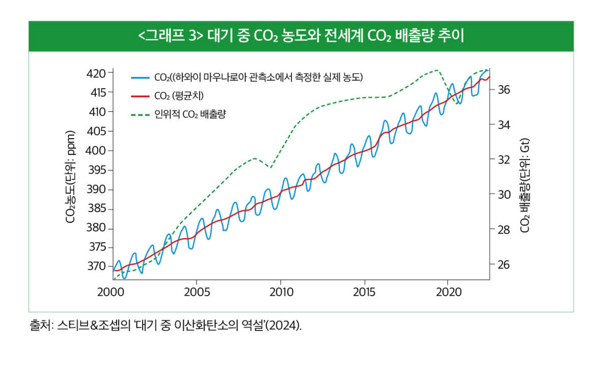 기후위기 부정파는 코로나19 시기가 인류의 이산화탄소 배출이 지구온난화와 관계가 없다는 사실을 증명해 줬다고 주장한다. 코로나19 시기에는 공장 가동, 해외여행 등이 줄어 화석연료 사용이 크게 감소했다. <그래프3>을 보면 코로나19가 발생한 2020년 이후 인간 활동으로 인한 이산화탄소 배출량도 10~15% 정도 급감했다. 그럼에도 대기 중 이산화탄소 농도는 이전과 동일한 속도로 꾸준히 증가했다. 이는 인류의 이산화탄소 배출이 대기 중 이산화탄소 농도에 전혀 영향을 미치지 못하며, 나아가 지구온난화에 대한 영향 역시 없다는 것을 의미하는 근거로 활용된다.