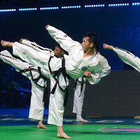 ‘2017 무주 WTF 세계태권도선수권대회’ 개막식이 열린 6월 24일 오후 전북 무주군 태권도원 T1경기장. 북한 태권도 시범단이 발차기 시범을 하고 있다.6월 30일 열린 대회 폐막식에서도 북한 시범단은 격파와 호신술 등 다양한…