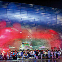 1 밤에 더 화려하게 피는 동대문 LED 장미 정원.2~5 갖가지 음식과 상품, 볼거리가 어우러진 야시장.1 거리 공연이 여름밤의 흥취를 돋운다.2, 4, 5 연인, 친구, 가족에게 야시장은 낭만의 공간이다.3 소상공인들이 진열대에…