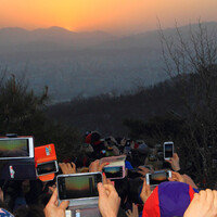 신년 일출을 촬영하는 시민들의 손이 분주하다. 1 새해 신새벽 한기를 뚫고 퍼지는 타악기의 울림. 2 서울 응봉산 개나리공원에 ‘합격 기원’ 같은 소원을 담은 쪽지가 주렁주렁 달렸다.