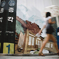 서민의 정취를 풍기던 옛 피맛골 터에서 공사가 한창이다. 공사장 담벼락에 그려진 그림들이 향수를 불러일으킨다. 1. “이제 동이 텄으니 집으로 가볼까?” “쟤들은 뭐니? 우린 출근하는데….” 2. 키스 세례를 받은 남자를 본체만체하…