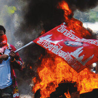 태국에서 반정부 시위격화로 유혈사태가 발생한 가운데 4월13일 한 시위참가자가 불타는 타이어 앞에서 깃발을 흔들고 있다.
