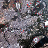 아미산(해발 156m) 일대 사진에서 가장 먼저 눈에 띄는 것은 ‘금수산의사당’(사진①)이다. 전체사진(앞 페이지) 하단에 있는 5·1경기장과 맞먹는 규모의 이 건축물은 김일성 주석이 생전에 머물던 공식관저이자 현재는 김 주석의 시…