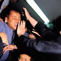 ◀ “저XX 죽여!” 민주당 당무회의에서 구주류측 당직자들이 신기남 의원에게 달려들자 신주류측 보좌진들이 신의원을 몸으로 에워싸고 있다.